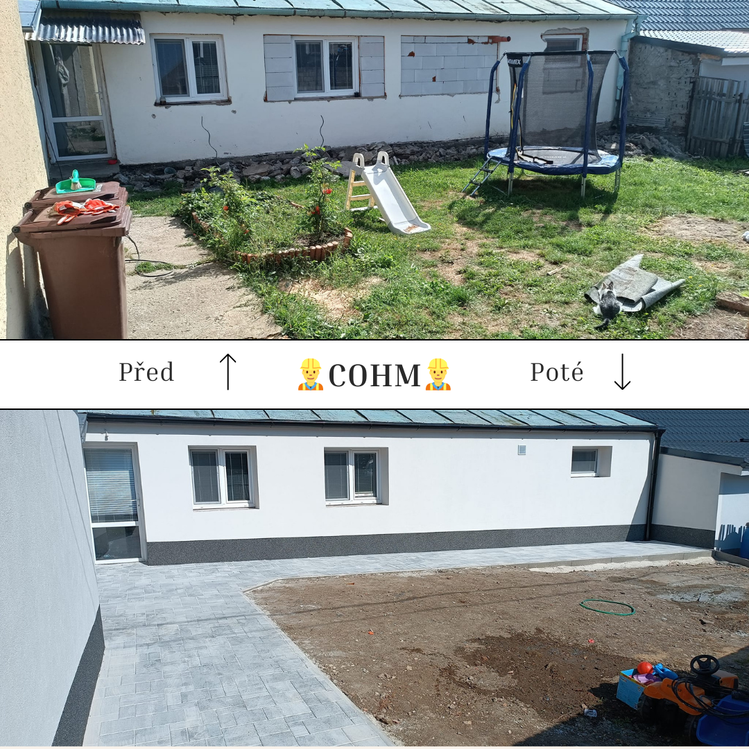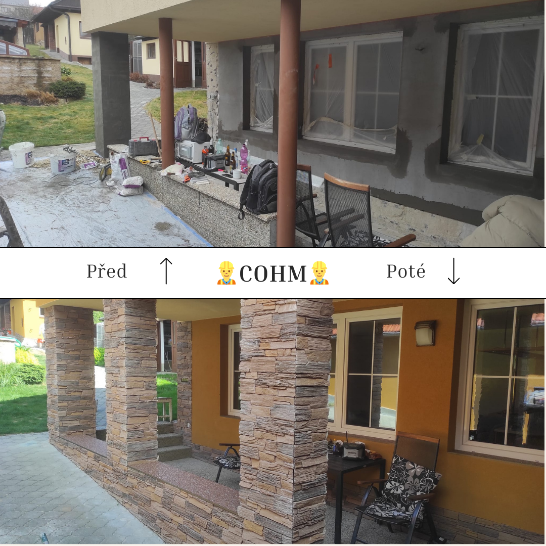 Fasáda, obklad, výměna oken a dveří, kamenný koberec, bednění